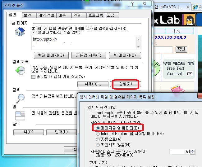 우측 화면에서 "검색기록"의 삭제를 눌러 캐시를 삭제하고 "설정" 을 "페이지 열때 마다 " 로 변경하십시오.